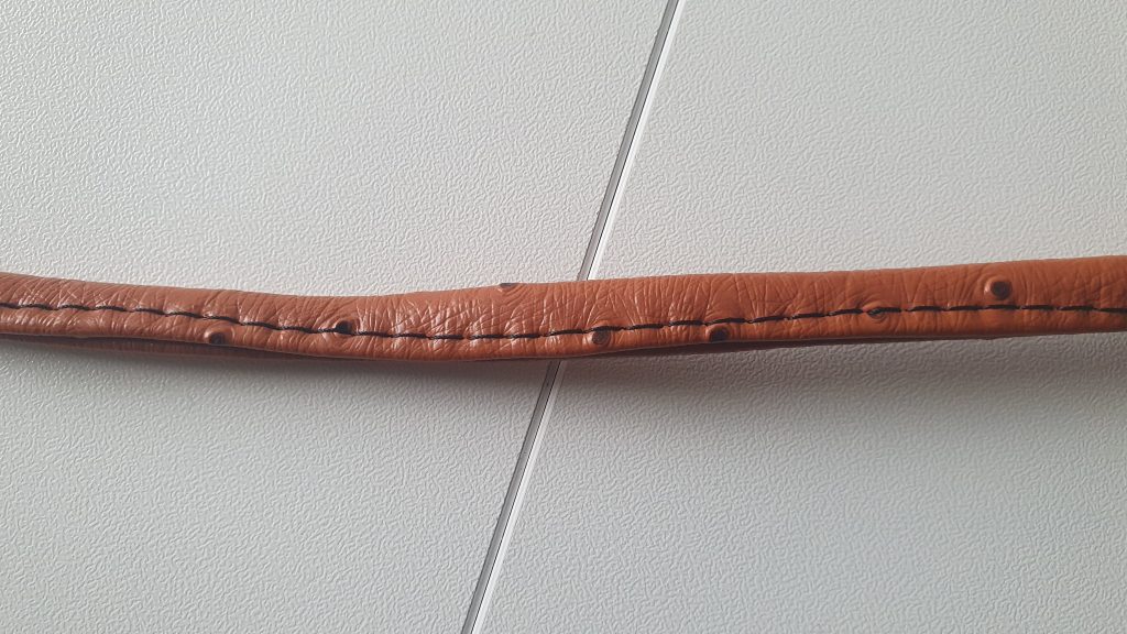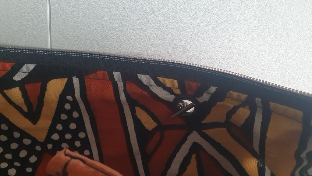 18- Couper une bande dans le tissu extérieur. La largeur de la bande dépend de la largeur des œillets.  L’anse doit être un peu plus étroite pour entrer dans l’œillet et assez épaisse pour s’y maintenir correctement.