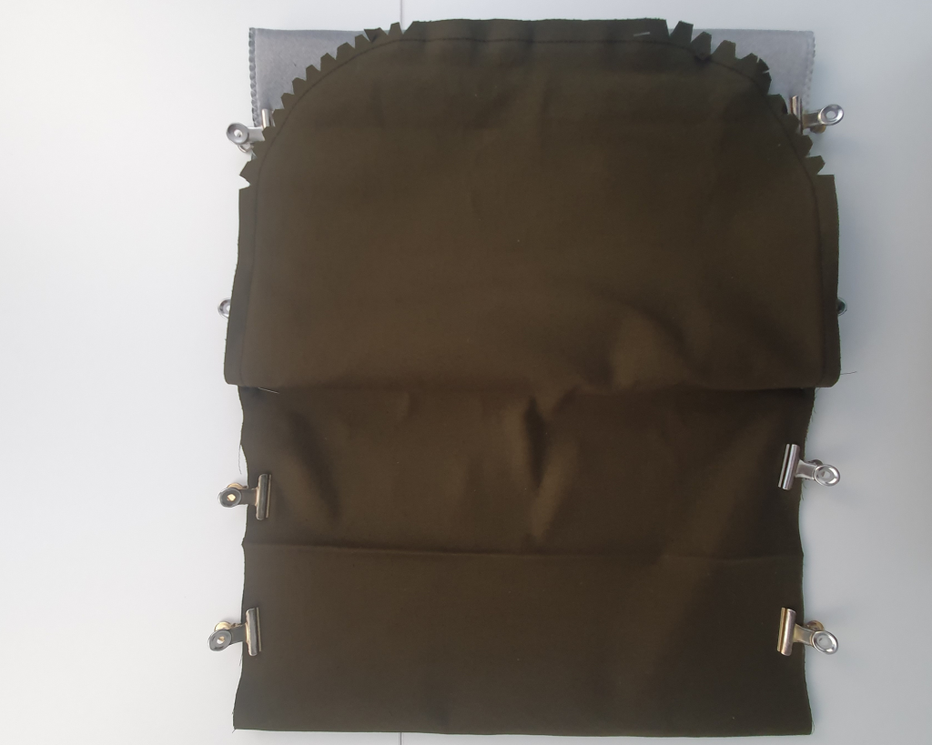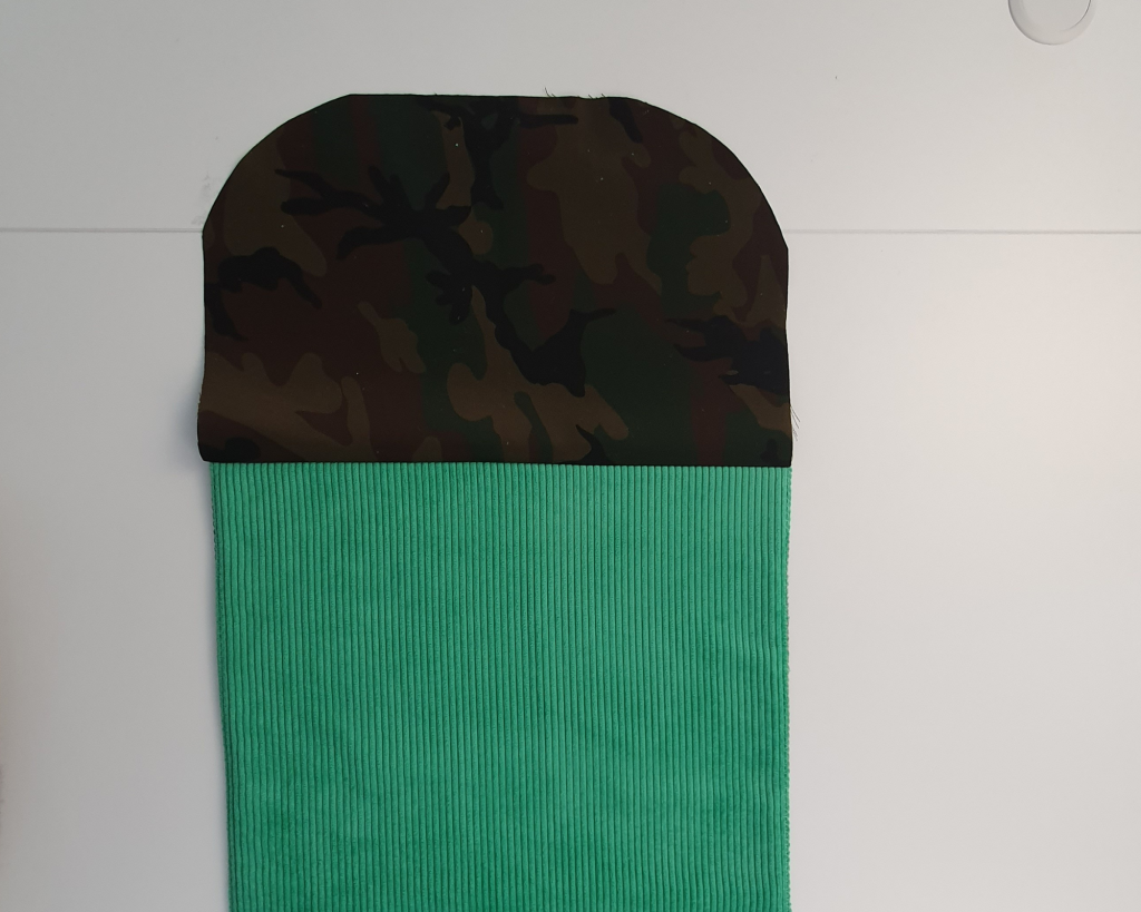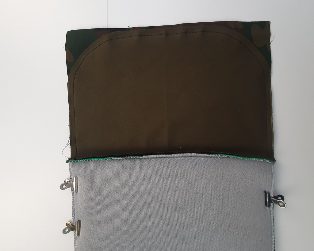 A ce stade on obtient une partie doublure ouverte sur deux côtés, une partie tissu extérieur également ouverte sur deux côtés et une dernière partie entièrement fermée composée du tissu extérieur et de la doublure, c’est le rabat.