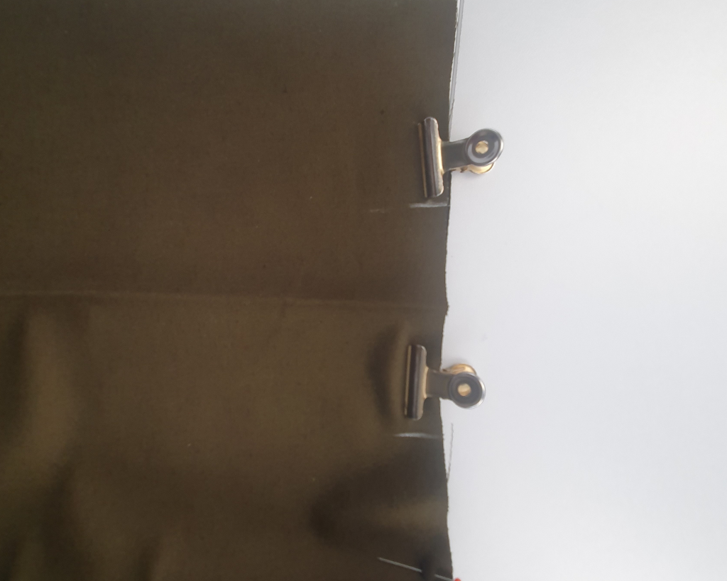 8- De chaque côté, aligner la couture du bas contre la couture du rabat (donc contre le repère).