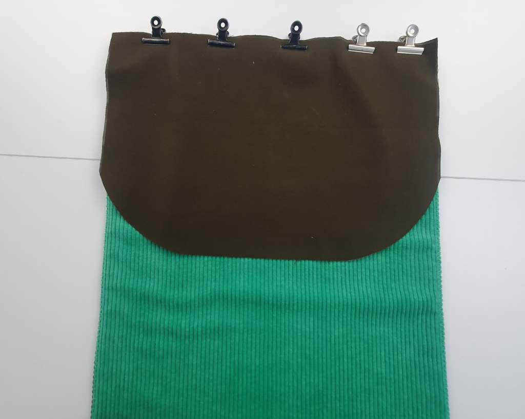 4- Positionner la pièce extérieure du rabat et le corps endroit contre endroit, le bas du rabat contre le haut du corps, puis assembler.