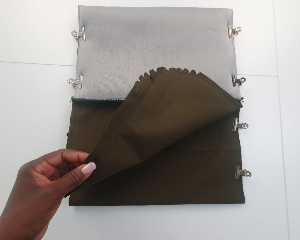 7- Couper l’excédent de tissu dans la partie doublure au niveau du rabat.