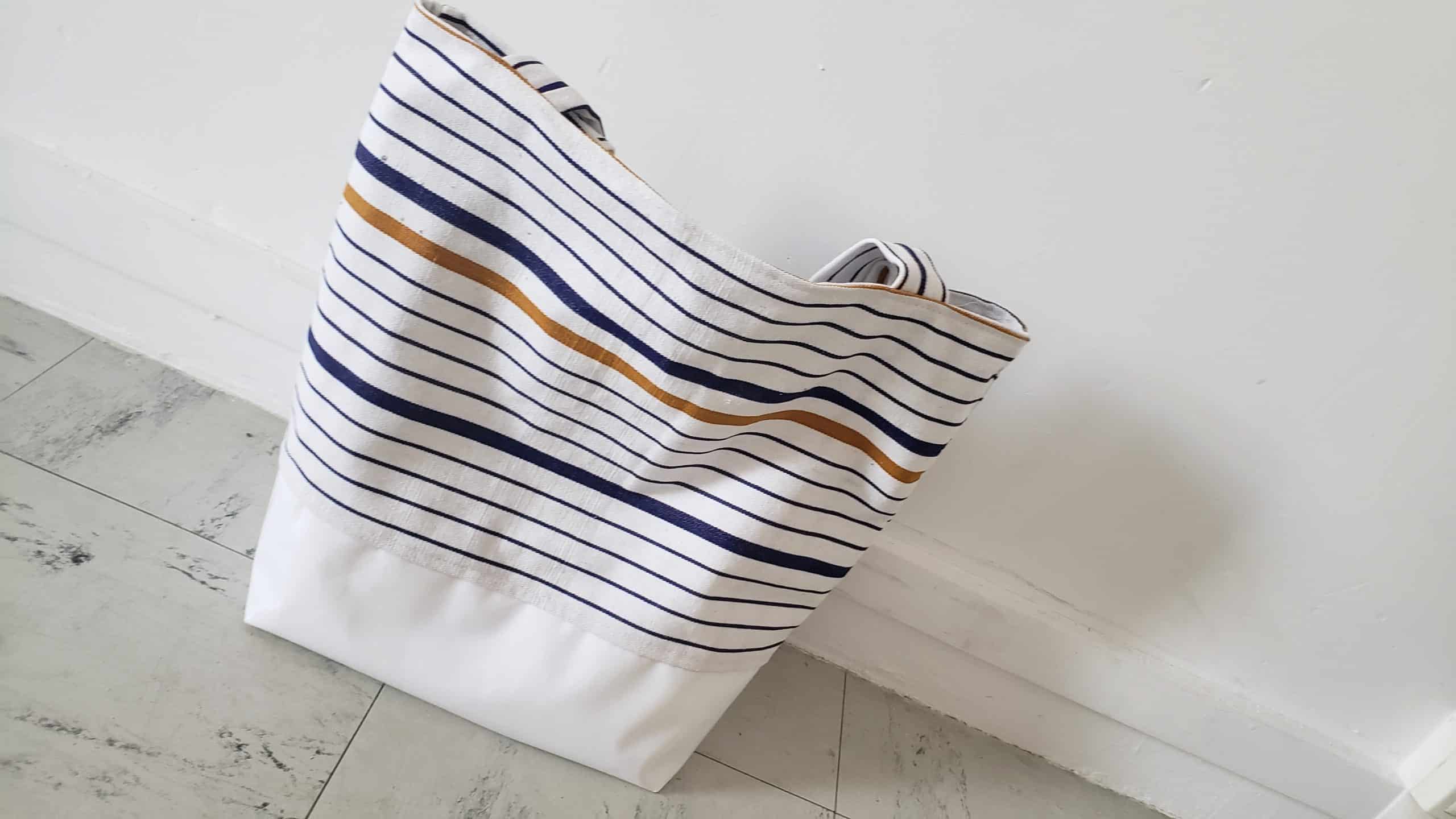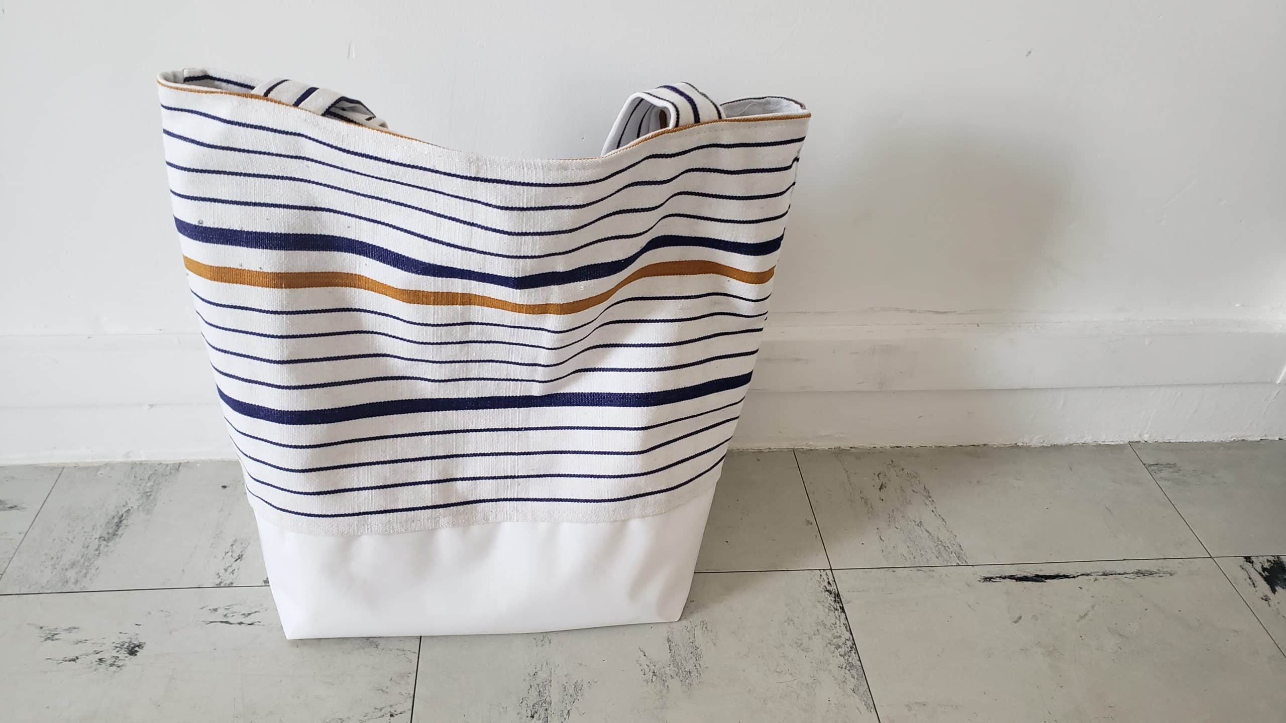 Se prélasser à la plage, oui mais avec style ! Retrouvez un patron de sac de plage réalisé avec un tissu élégant tout droit venu d’Afrique, le faso dan fani, mixé à un tissu qui résiste à l’eau, la toile cirée.