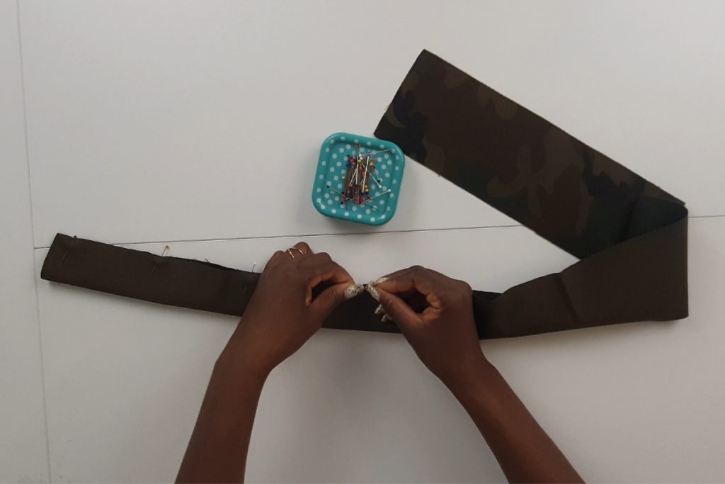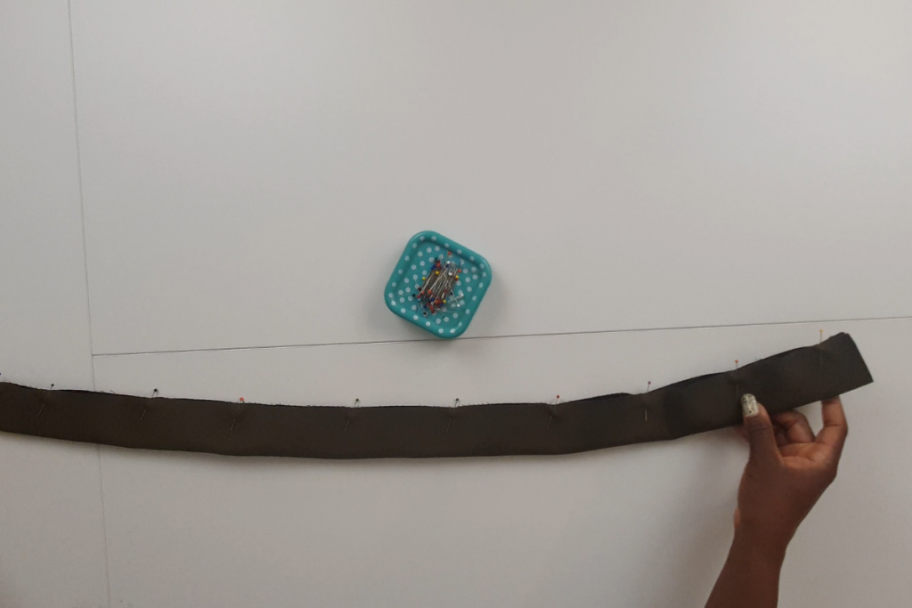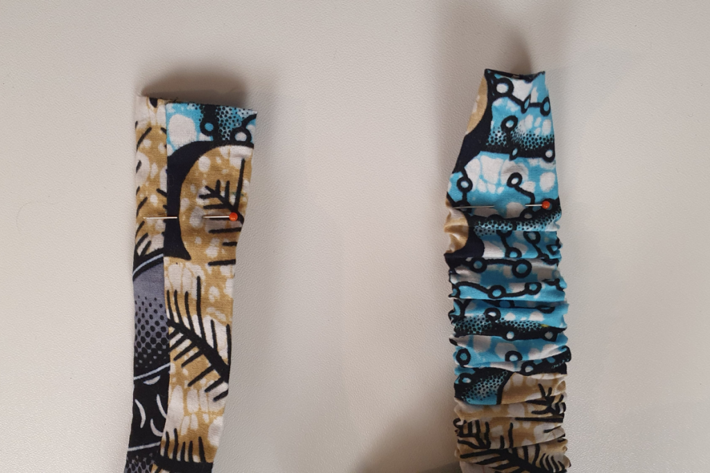 7- Une fois que toute la longueur de l’élastique est insérée, positionner ses extrémités à 3 cm du bord de chaque côté de la bande de tissu (donc au niveau des repères) et épingler pour le maintenir en place.