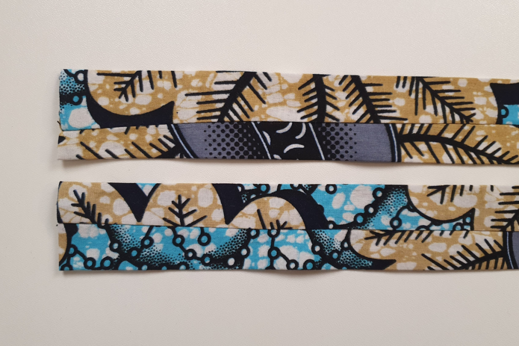 2- Plier la bande en deux dans le sens de la longueur et endroit contre endroit, puis piquer en partant d’une des extrémités jusqu’en haut de l’autre extrémité.
