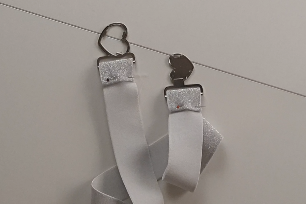 3- Procéder exactement de la même façon avec l’autre extrémité de l’élastique et l’autre partie de la boucle de ceinture. Attention à ce que l’élastique reste bien droit, qu’il ne s’entortille pas et que les deux boucles soient dans le même sens pour pouvoir être clipsées correctement l’une dans l’autre.